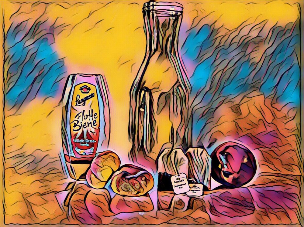 viel Eiswürfel gießen. Zitrone und Honig nach Gusto und mit Wasser (still) auffüllen.